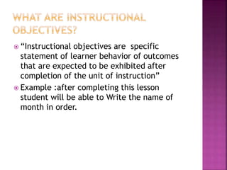 Instructional objectives are specific statements that describe the expected learner behaviors or outcomes after completing instruction. They guide both teaching and learning by communicating the intended goals and providing assessment guidelines. Objectives should be stated in terms of observable learner performance rather than content, process, or teacher actions. Common frameworks for writing objectives include Bloom's Taxonomy, which categorizes objectives according to cognitive, affective, and psychomotor domains, and methods developed by Mager and Gronlund that specify the expected performance, conditions, and standards of the objective.