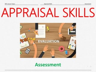 This document provides an overview of appraisal skills and assessment techniques. It discusses various methods for assessing employee performance, including assessment schemes, rating scales, behavioral anchored rating schemes, and self-assessment. Key tips for effective assessment include focusing on facts, avoiding biases, and providing constructive feedback that separates criticism of performance from criticism of the person. The goal of assessment should be personal and professional development rather than judgment.
