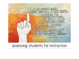 The document discusses stages of learning, learning styles according to Carl Jung, monitoring student progress, response to intervention, grading practices, and literacy assessments including Dibels, Running Records, PASI and when to use them. It provides an overview and practice of administering various literacy assessments to monitor student progress and determine response to intervention.