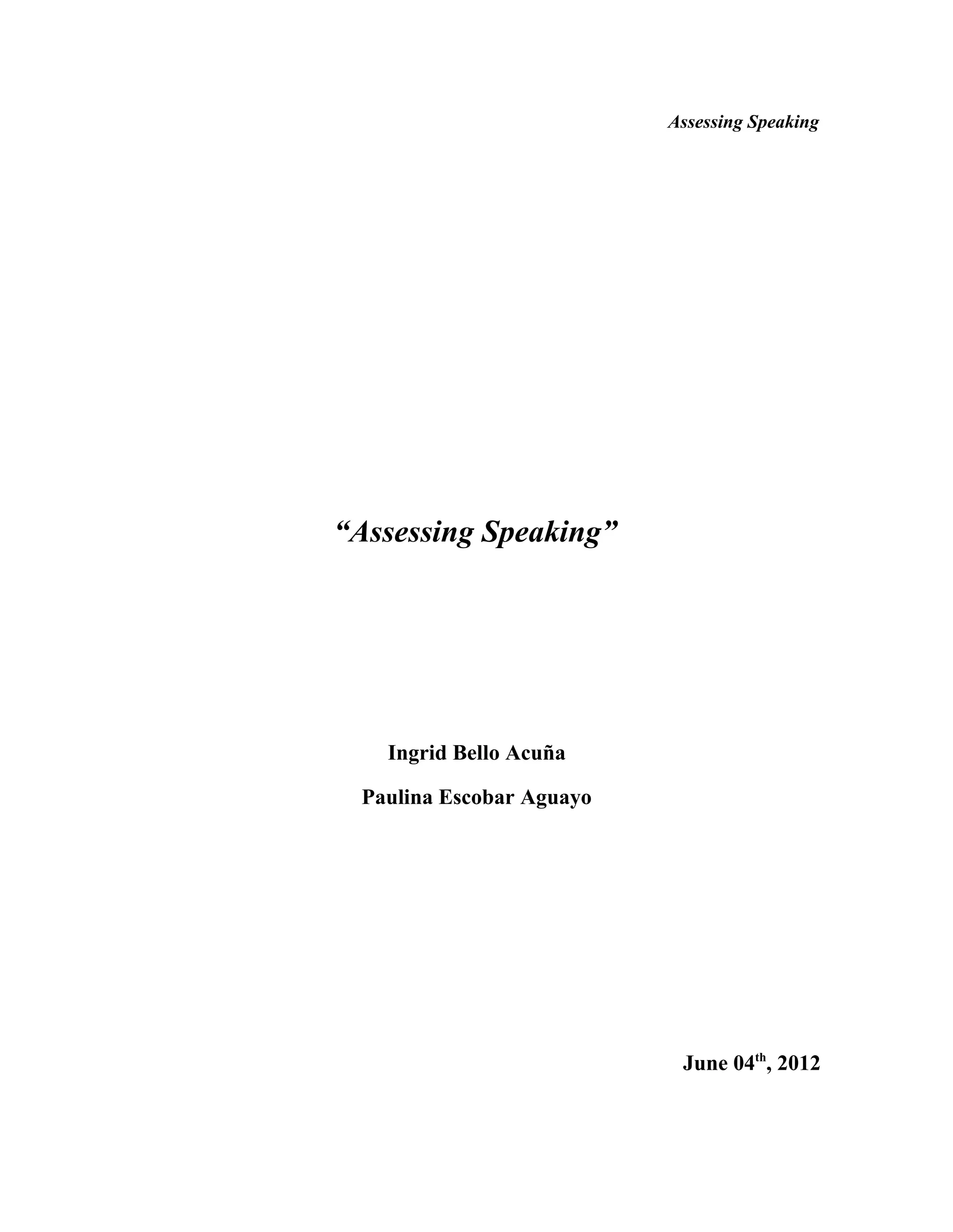 This document discusses assessing speaking ability through an oral examination given to 35 first-year high school students in Tomé, Chile with a lower English level. It describes a three-part test to measure vocabulary, grammar, and pronunciation. The test includes an interview, describing pictures to a partner, and asking about objects/people in a shared picture. Scoring will be done through an analytic rubric from 1 to 4 on indicators of proficiency. The goal is to create a reliable, valid, and authentic assessment considering the students' English level.
