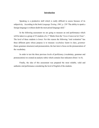 This document discusses assessing speaking skills for students at the Liceo Comercial de Tomé high school in Chile. It proposes a 3-part oral assessment to measure students' vocabulary, grammar, and pronunciation. The assessment includes: [1] an interview where students answer questions about themselves; [2] describing pictures to a partner; and [3] asking about locations and activities in a shared picture. Scoring will be analytic using a 4-point rubric. The goal is to create a reliable, valid, and authentic assessment considering the students' lower English level.