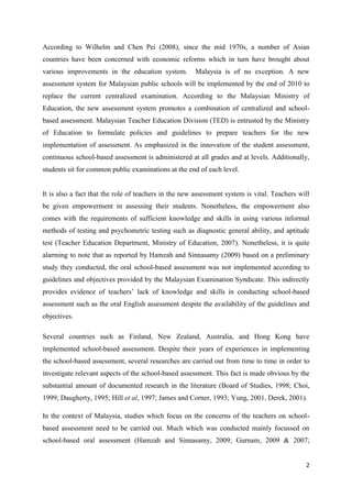 The document summarizes a study that examined Malaysian English teachers' concerns regarding the implementation of school-based assessment using a revised Stages of Concern Questionnaire. The study surveyed 40 English teachers and found: