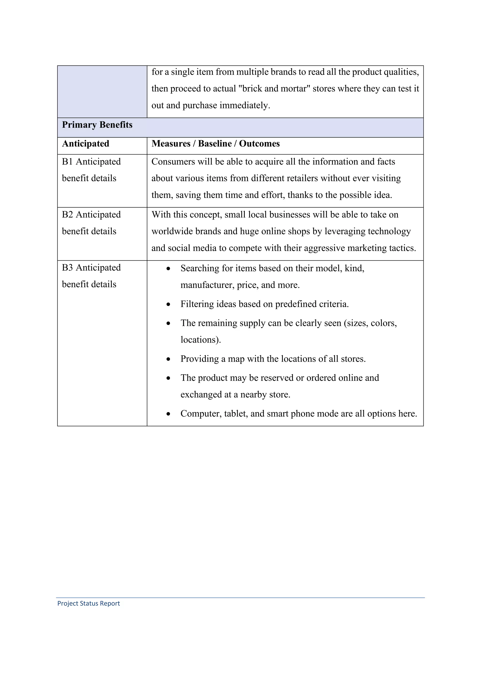 The project status report provides an update on the Shopronto e-commerce project from May 12th to June 30th. Key activities during the reporting period include further investigating opportunities for consumers and shops in the fashion industry, initiating collaborations with local merchants, and hiring new employees. Planned activities that were not completed include management review, creating digital portfolios, system testing, and hiring processes. Risks to the project include issues with materials, quality control, and financial losses from order cancellations. The budget shows actual expenditures exceeding projections for labor, materials, and other costs.