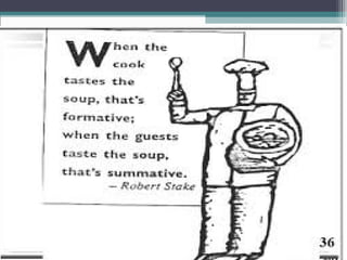 This document provides an overview of assessment in education. It defines various types of assessment including formative assessment, summative assessment, internal assessment, and external assessment. Formative assessment involves evaluating student progress and providing feedback, while summative assessment occurs at the end of a course to determine mastery of learning outcomes. Internal assessment is conducted by teachers, while external assessment involves an outside body evaluating students. The document discusses principles, purposes, and examples of different assessment types.