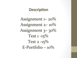 This document outlines the grading breakdown and assignment requirements for a psychology course. The grade is determined by 3 assignments, 2 tests, and an e-portfolio. Assignment 1 is an individual journal entry worth 20% of the grade. Assignment 2 is a group comic project worth 10% of the grade. Assignment 3 is the largest assignment, worth 30% of the grade, and consists of creating a 3-5 minute video applying course concepts, writing a 1500 word report, and presenting the video to the class. The assignments require students to apply concepts from class to personal experiences and communicate core ideas through different media like writing, drawing, and filmmaking.