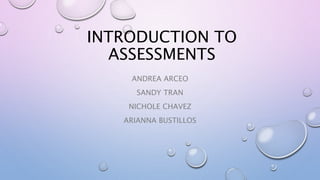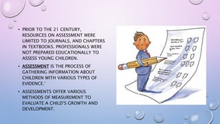 This document provides an introduction to assessments for young children. It discusses how assessments gather information about children's development and growth through various methods of measurement. Assessments are used to evaluate children, diagnose developmental delays, place children in programs, and assist with program planning. They consider diverse families, cultures and languages. Having multiple assessments that evaluate different developmental areas can support decisions about children's placements and guide curriculum planning. Context-based and ecological assessments that consider a child's entire environment and influences are preferred.