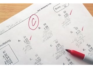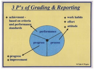 The document discusses principles of effective grading and assessment to drive instruction. It recommends that assessments should primarily be used for grading and feedback should be timely, specific, understandable, and allow students to act on it. Examples are given comparing two students' grades calculated in different ways, and the importance of setting achievable goals and high expectations for students is discussed.