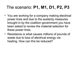 The document outlines an assessment activity for reviewing material selection for electrical power lines to reduce resistance and energy loss. The goals are to: state what will be achieved; research and list notes on protocols to reduce resistance; and produce a hypothesis. Additionally, a table of research references must be drawn, analyzing relevance and discussing reasons. A method must be written and other considerations outlined with justifications for the final choice. Good referencing from multiple sources and fully evaluating alternatives are grading tips provided.