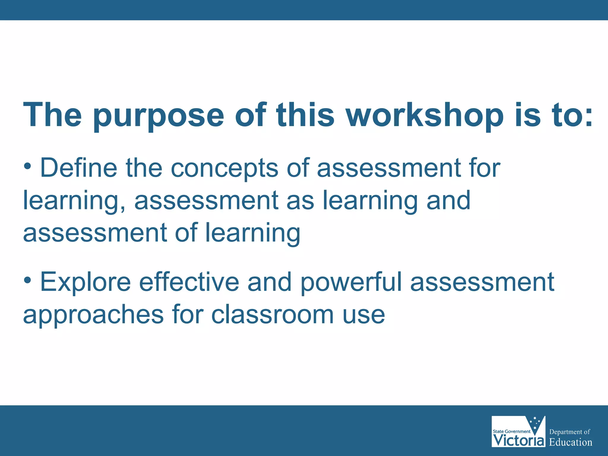 The document discusses different types of assessment: assessment for learning, assessment as learning, and assessment of learning. It defines each type and provides examples. Assessment for learning occurs when teachers use student evidence to inform their instruction. Assessment as learning is when students self-assess and set goals to monitor their own progress. Assessment of learning refers to formal tests used by teachers to make judgments about student achievement against standards.