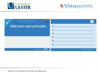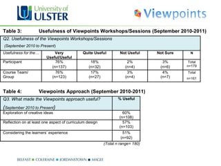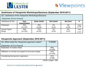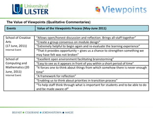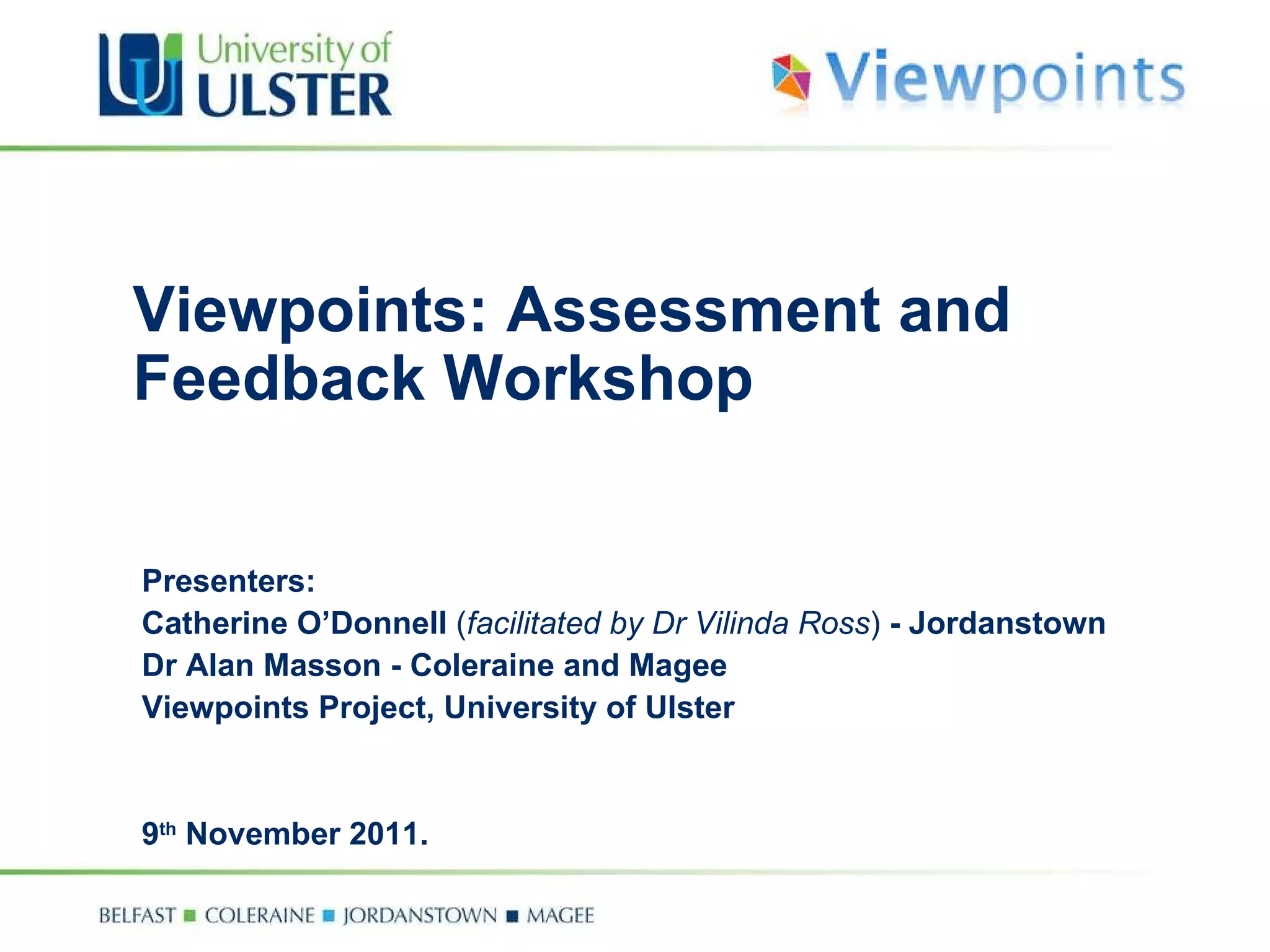 The document summarizes a workshop on assessment and feedback using the Viewpoints framework. Viewpoints is a curriculum design project that provides tools to help staff consider the learner perspective. The workshop involved groups using Viewpoints cards on assessment principles mapped to a student timeline to address objectives, then sharing outputs. Attendees found the workshop informative, engaging, and useful for considering assessment and feedback from the learner view.