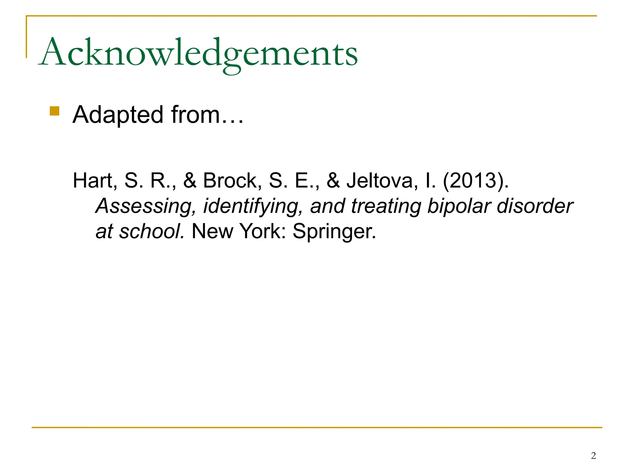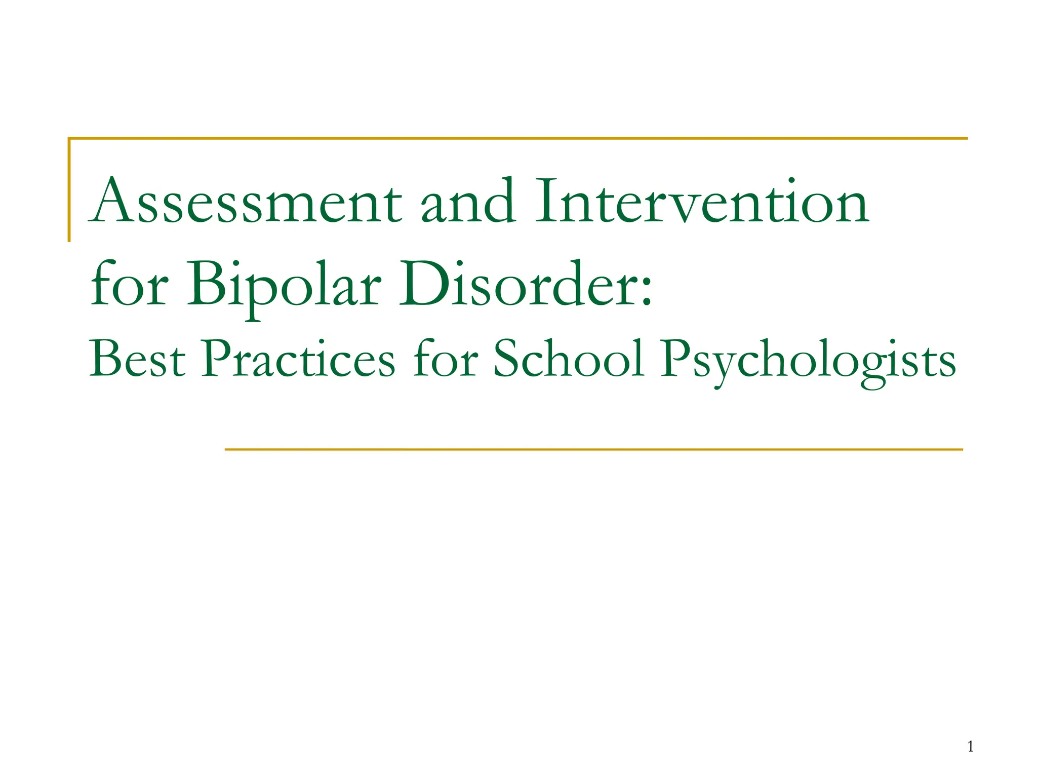 The document provides a comprehensive overview of bipolar disorder, focusing on its diagnosis, symptoms, and intervention strategies specifically for school psychologists. It details the DSM-5 diagnostic criteria, including classifications such as bipolar I, bipolar II, and cyclothymia, while emphasizing the challenges in identifying pediatric bipolar disorder due to overlapping symptoms with other conditions. The document also discusses best practices for screenings and interventions in educational settings to support students experiencing bipolar symptoms.