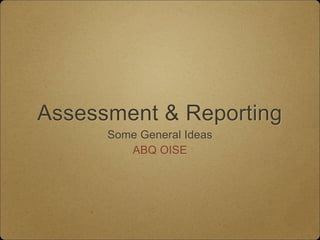 This document discusses assessment and reporting in education. It notes that the primary purpose of assessment is to improve student learning. It discusses the principles from the Growing Success policy document and provides Damian Cooper's metaphor that compares diagnostic assessments to try outs, formative assessments to practices, and summative assessments to games. The document also mentions that assessments should collect a variety of evidence, not just products, to best evaluate student learning. It describes the reporting process of a progress report in the fall with no marks, followed by two report cards during the year with letter grades in all subjects.