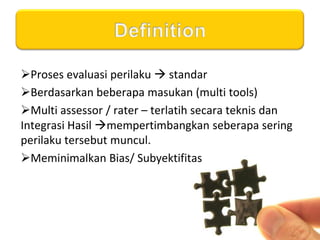 Dokumen ini menjelaskan metode assessment center yang melibatkan evaluasi perilaku menggunakan beberapa alat dan assessor terlatih untuk mengurangi bias dan meningkatkan validitas penilaian. Ini mencakup analisis jabatan, klasifikasi perilaku, dan teknik assessment yang beragam, serta penggunaan data dari berbagai sumber untuk mendukung pengambilan keputusan dalam perekrutan dan pengembangan karyawan. Selain itu, dokumen ini juga mencatat tantangan dan persiapan yang diperlukan untuk melaksanakan prosedur assessment yang efektif.