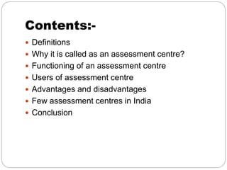 An assessment centre is a selection process used to evaluate candidates' suitability through various tests and simulations over a period of time. Companies like Xerox and KPMG in India employ this method for selection, training, and promotion, benefiting from comprehensive candidate evaluations by experts. Despite its advantages, the process is costly and time-consuming, requiring experienced evaluators and may lead to biased assessments.