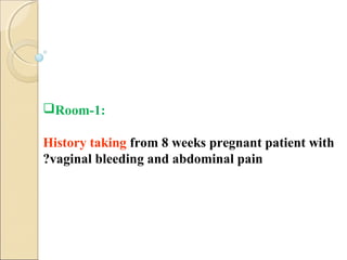 The document outlines an assessment examination for OBGYN consisting of 7 rooms evaluating various skills. Room 1 involves taking a history from a pregnant patient with vaginal bleeding and abdominal pain. Room 2 examines skills and findings from examining a patient after a normal vaginal delivery. Room 3 involves multiple choice questions about uterine sounds, speculums, oxytocin, curettes, and hysterosalpingograms. Room 4 presents an emergency preeclampsia case to diagnose, manage, and plan a delivery for. Room 5 involves analyzing a partogram to diagnose failure to progress labor and determine management. Room 6 presents an emergency ectopic pregnancy case to diagnose and manage. Room 7 involves identifying indications for various clinical presentations and procedures from