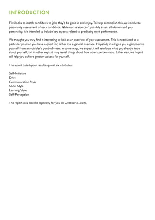 Jameson Emling completed a personality assessment through Fitzii to help match him to suitable jobs. The assessment evaluated him on six attributes: self-initiative (proactive and self-managing), drive (balanced motivation meeting goals and helping others), communication style (comfortable with some conflict), social style (sociable and outgoing), learning style (logical, analytical and detail-oriented), and self-perception (healthy self-confidence). The report provides details on Jameson's results for each attribute to give him insight into how others may perceive him and help him find career success.