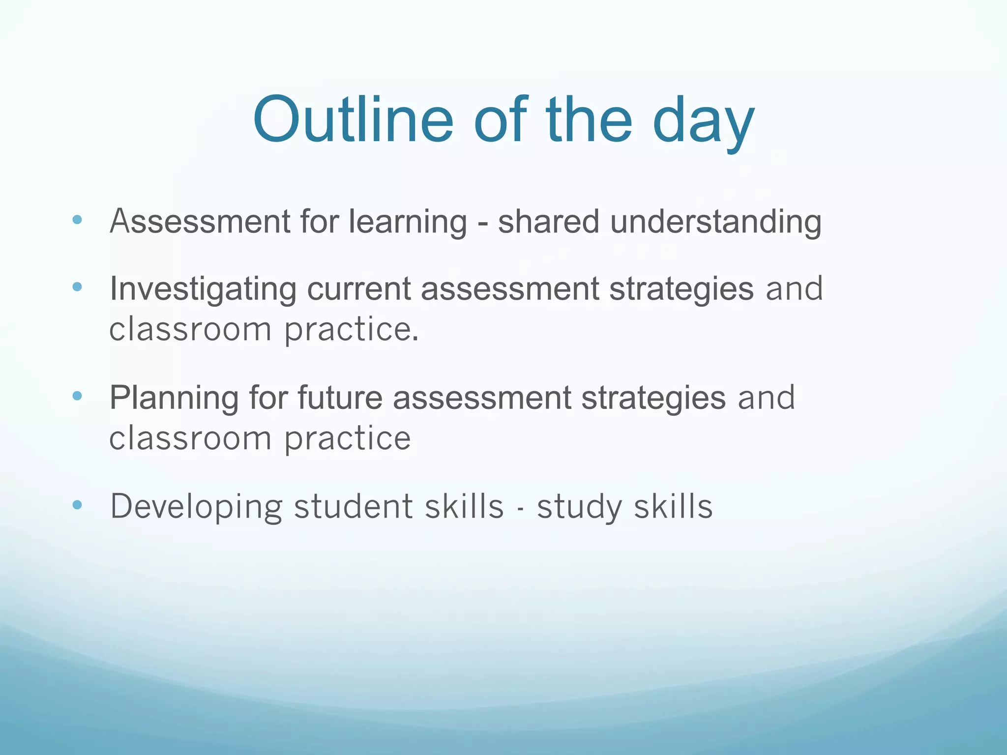 This document outlines an agenda for a staff development session focused on assessment for learning. It begins with establishing a shared understanding of assessment for learning and reflecting on current classroom practices. Participants will then work on developing student skills and modifying programs to better incorporate assessment for learning approaches. The goal is to help students become more self-regulated and responsible for their own learning. Key concepts that will be explored include the research supporting assessment for learning, challenges to implementing it, and strategies for clarifying learning intentions and providing effective feedback.