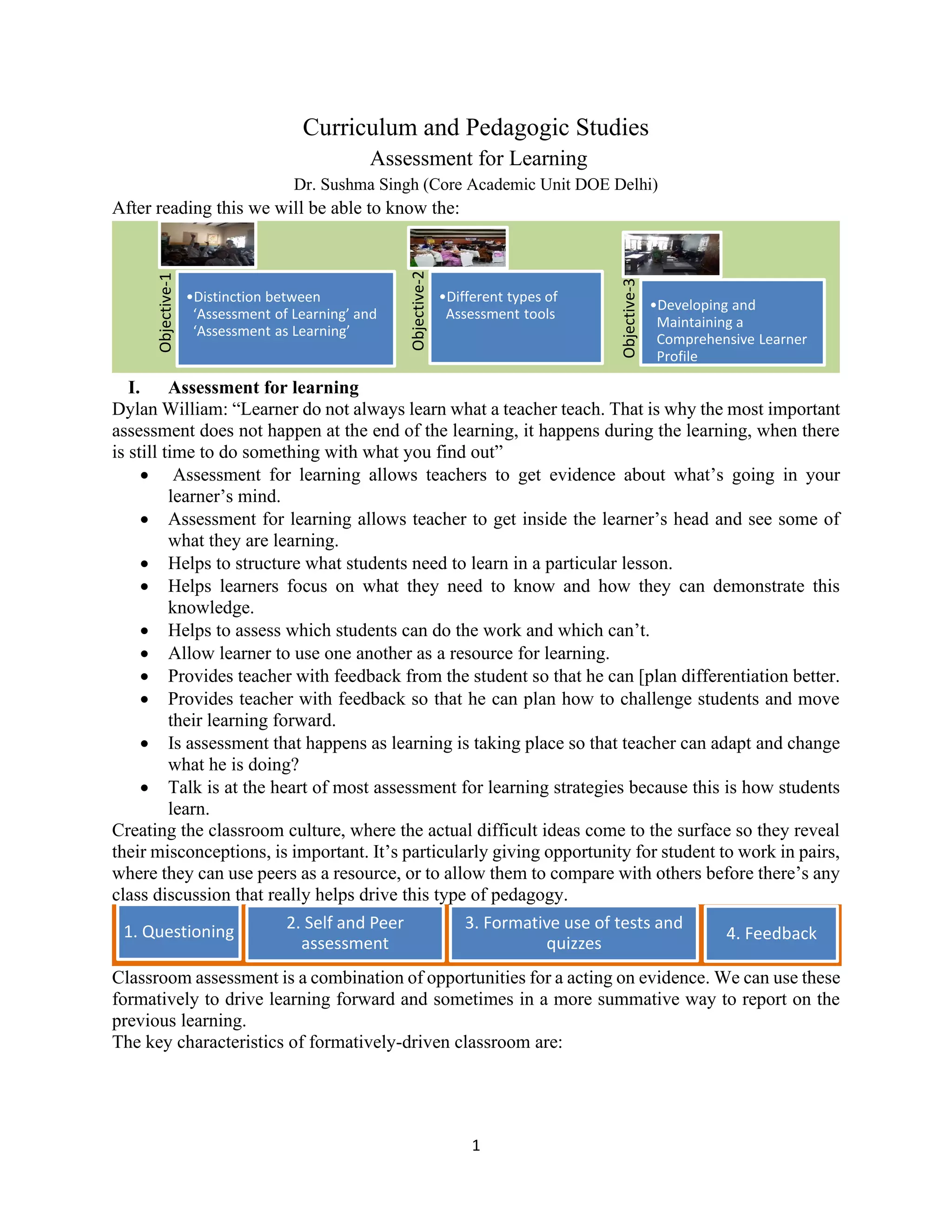 - Formative assessment tools mentioned include questioning, self-assessment, peer assessment, tests/quizzes, and feedback.
