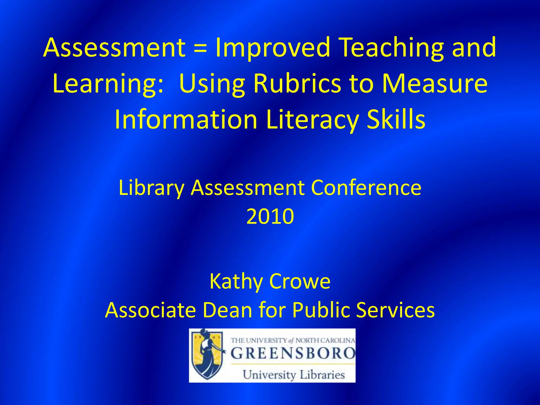 This document summarizes an assessment study conducted by Kathy Crowe at the University of North Carolina at Greensboro to evaluate student learning of information literacy skills in a Communication Studies course. The study used rubrics to assess student worksheets from library instruction sessions over three semesters. Scores improved after recommendations were implemented, such as requiring an online tutorial and revising the rubric. While citation skills remained challenging, the study provided useful evidence of student learning and informed collaborations between librarians and teaching faculty to further improve information literacy in the curriculum.