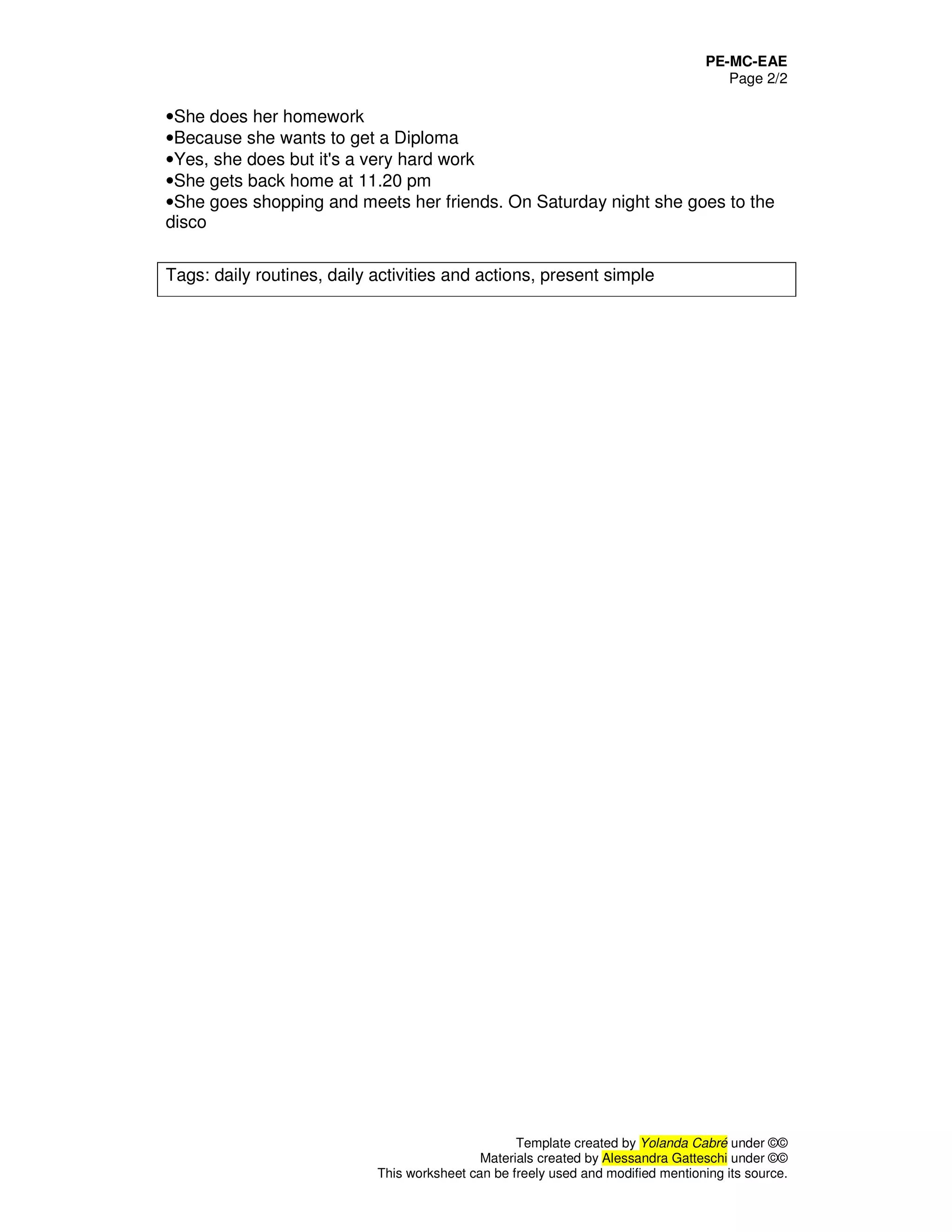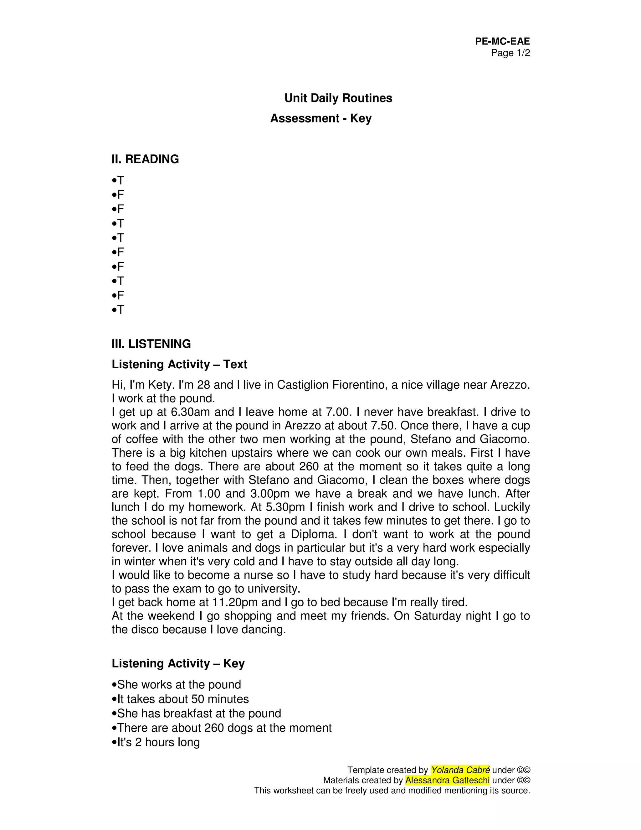 This document contains a reading comprehension worksheet about a woman named Kety's daily routine. It provides details about her job at an animal pound, her schedule each day from waking up at 6:30am until returning home at 11:20pm, and her goals of getting a diploma and becoming a nurse. The worksheet also includes a short listening passage about Kety describing her routine and answers to comprehension questions about the passage.