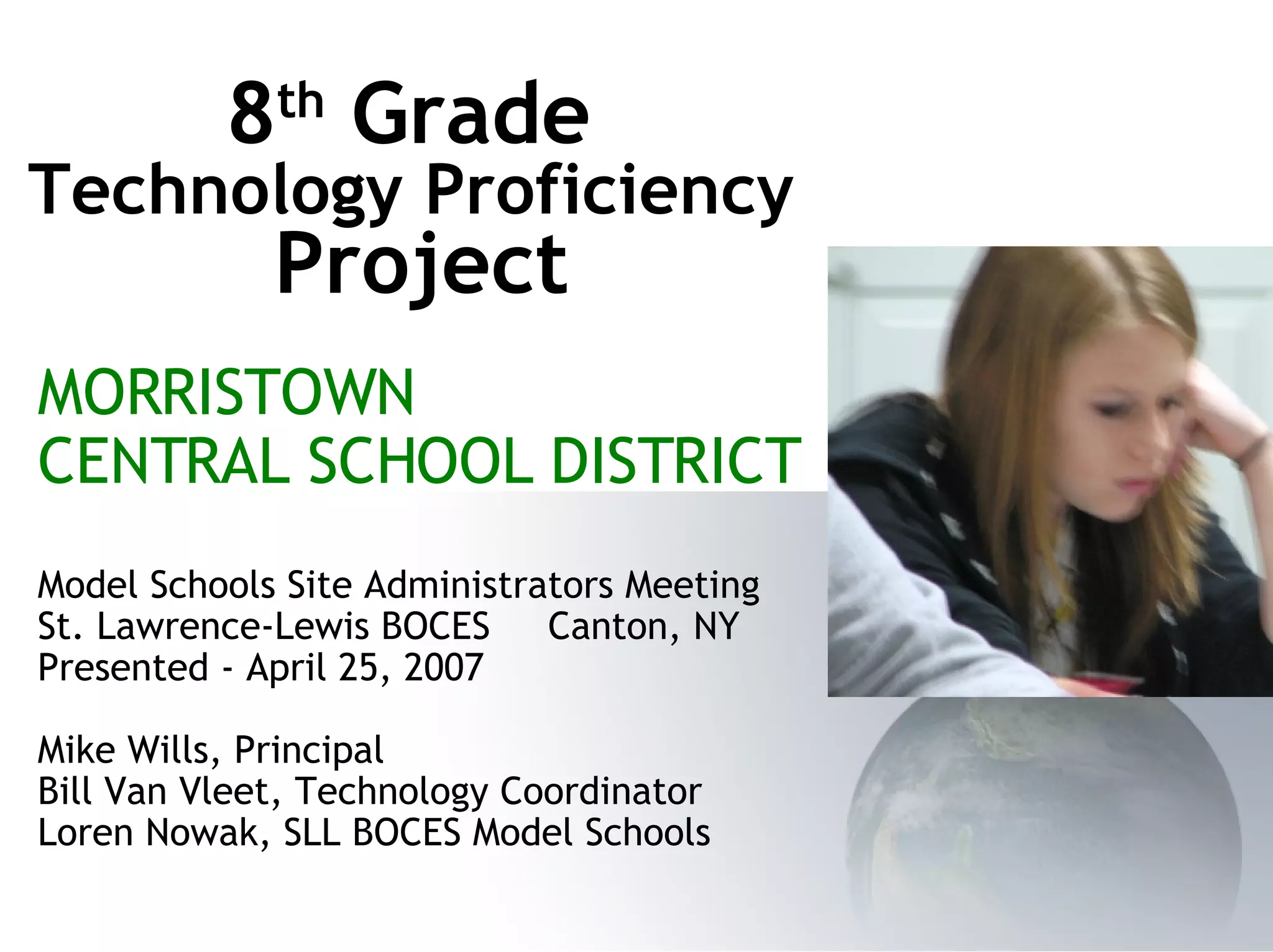 The document describes an 8th grade technology proficiency project conducted by the Morristown Central School District. It discusses the formation of a technology committee to develop a proficiency test for 8th grade students. The test consisted of three parts - a 70 question multiple choice section, a business letter activity using word processing skills, and a planet project assessing additional skills. Results found the average score to be 46% and identified gaps in students' technology preparation. The district concluded that technology instruction needs to begin earlier and be better coordinated across grades to improve proficiency.
