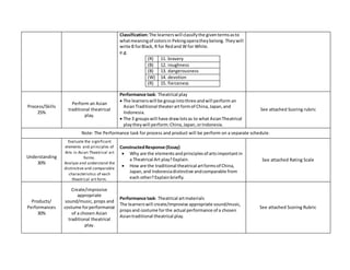 This document outlines an assessment matrix for an 8th grade Arts assessment on Asian theatrical forms from China, Japan, and Indonesia. It will assess students' knowledge, process/skills, understanding, and products/performances. For knowledge, students will take a multiple choice test to identify elements of Asian theater. They will also perform an Asian play in groups and create costumes and props for it. Understanding will be evaluated through an essay analyzing significant elements and comparing theatrical forms. Performance will be scored using rubrics evaluating elements, organization, and character roles.