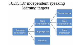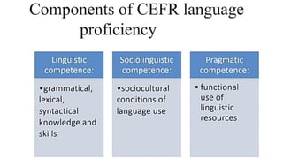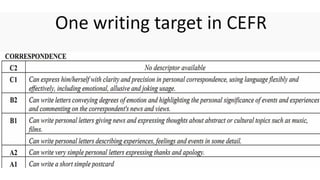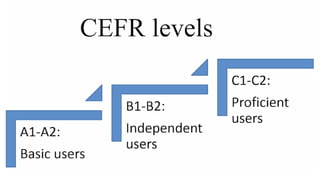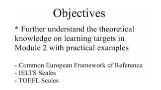This document discusses language assessment targets and proficiency levels. It introduces the Common European Framework of Reference (CEFR), which established international standards for language learning, teaching, and assessment. The CEFR describes language abilities through 6 proficiency levels from A1 to C2. It also uses "can do" statements to outline the communication skills learners have at each level without focusing on grammar. The document then explains how major English tests, like the TOEFL and IELTS, develop assessment targets based on the CEFR levels and proficiency descriptors.