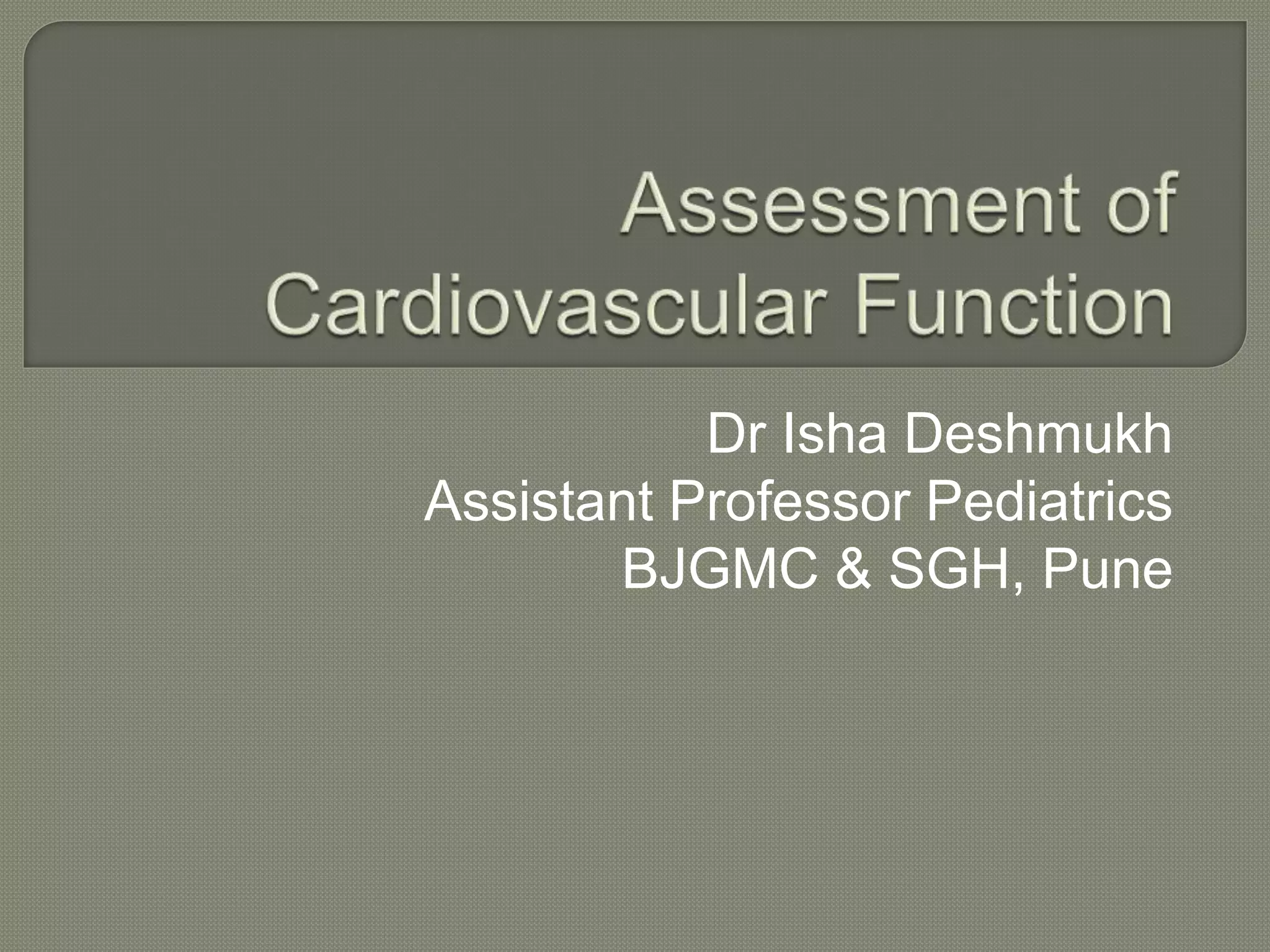 The document outlines various cardiovascular assessment and monitoring techniques in pediatric intensive care units, emphasizing the importance of physical examination, diagnostic imaging, and blood pressure monitoring. It discusses key indicators of cardiac function such as heart rate, blood flow, and oxygen transport, and details methods for evaluating tissue hypoxia and intravascular fluid status. The document also covers implications of cardiac function on patient management, including the use of inotropes and the impact of pulmonary and vascular health on overall patient outcomes.