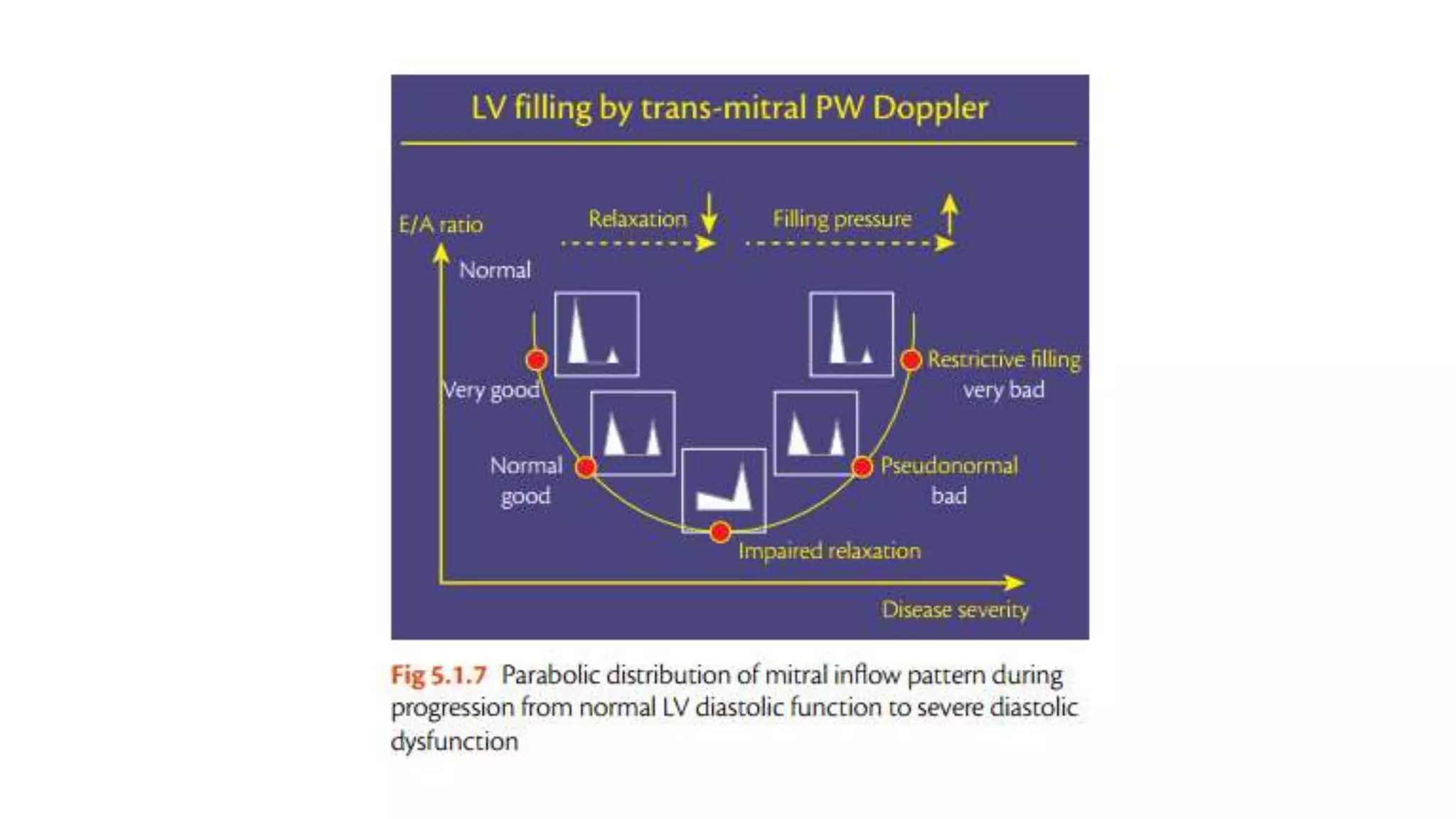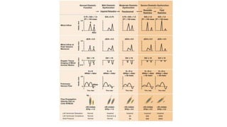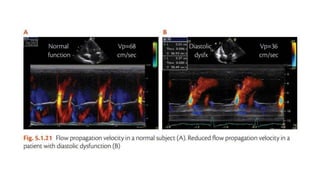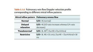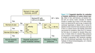 This document outlines the integrated echocardiographic approach for assessing left ventricular diastolic function. It describes the four phases of diastole and how pulsed-wave, tissue, and color Doppler can be used to evaluate parameters like mitral inflow velocities, pulmonary vein flow, tissue velocities, and isovolumic relaxation time. By integrating measurements of left atrial size, ventricular filling velocities, annular velocities, and other Doppler data, diastolic dysfunction can be detected and graded.