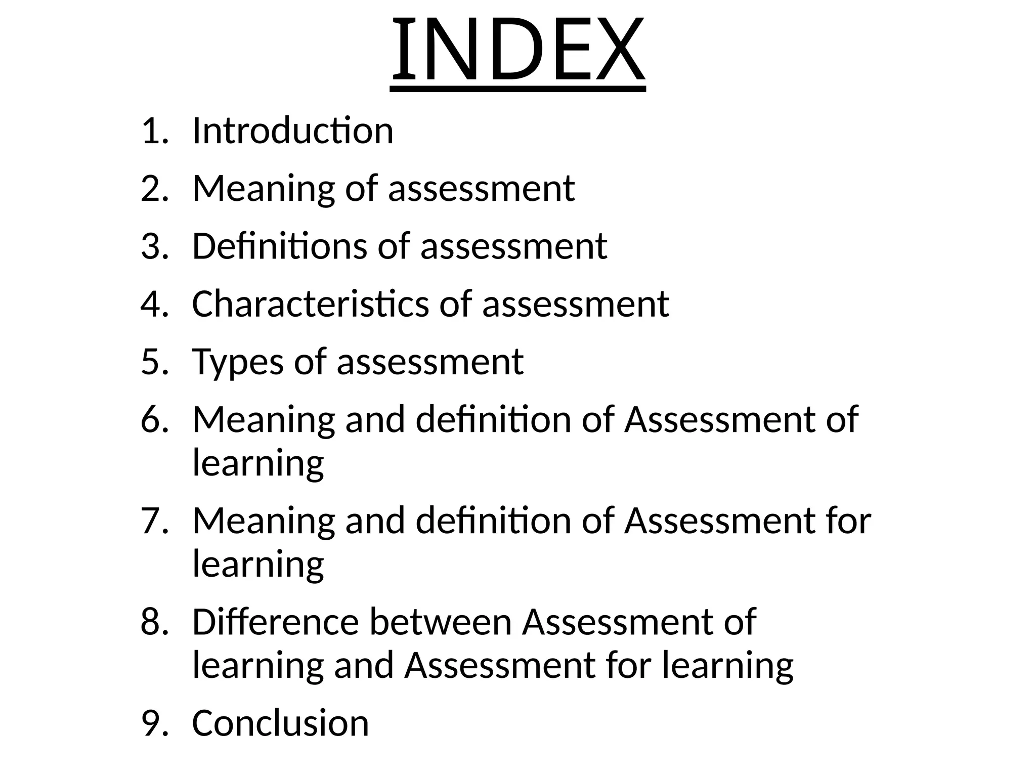 The document discusses two main types of assessment in education: 'assessment of learning', which is a summative evaluation measuring student achievement at the end of a learning period, and 'assessment for learning', which is a formative process providing ongoing feedback to improve student understanding. It outlines definitions, characteristics, types, and the roles of teachers and students in both assessment methods. The conclusion highlights that while 'assessment of learning' offers a static view of student performance, 'assessment for learning' focuses on continuous improvement and student engagement in the learning process.