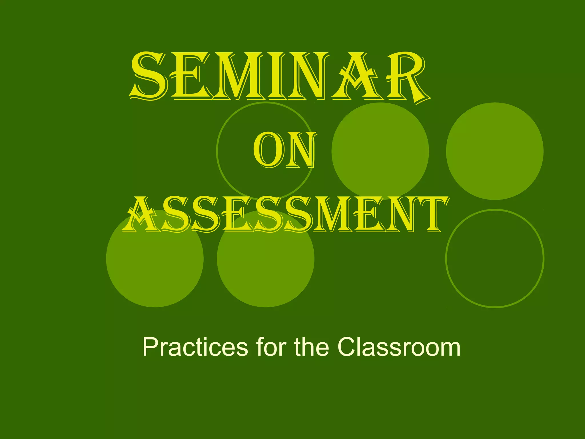 1. The seminar discussed principles of effective assessment including formative and summative assessment. Formative assessment involves gathering evidence of student learning to inform instruction while summative assessment evaluates student achievement.