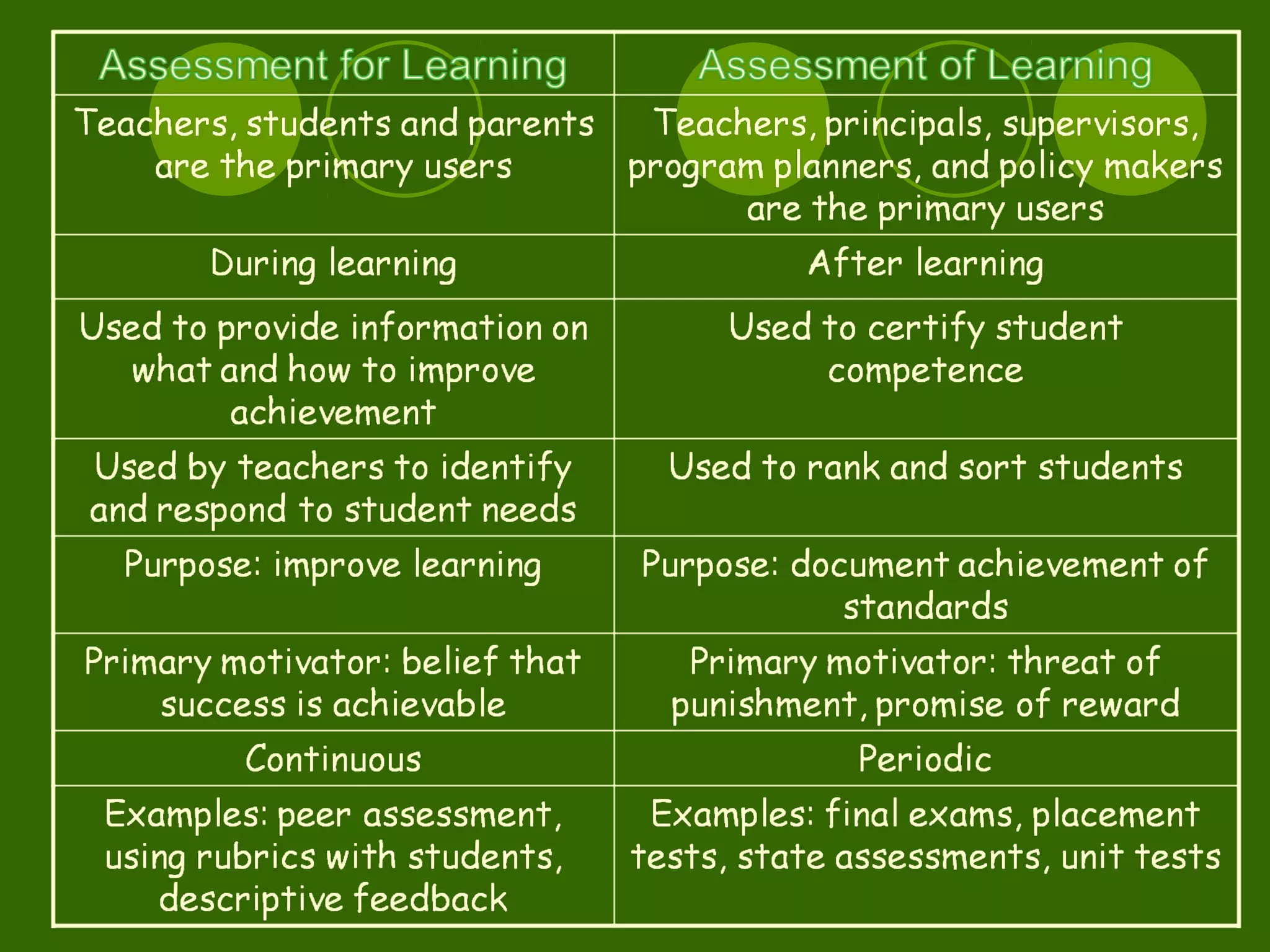 3. The document outlined three main types of assessment: assessment for learning (formative), assessment as learning which develops student metacognition, and assessment of learning (summative evaluation). Quality assessment identifies clear purposes and targets, involves students, and provides effective feedback.
