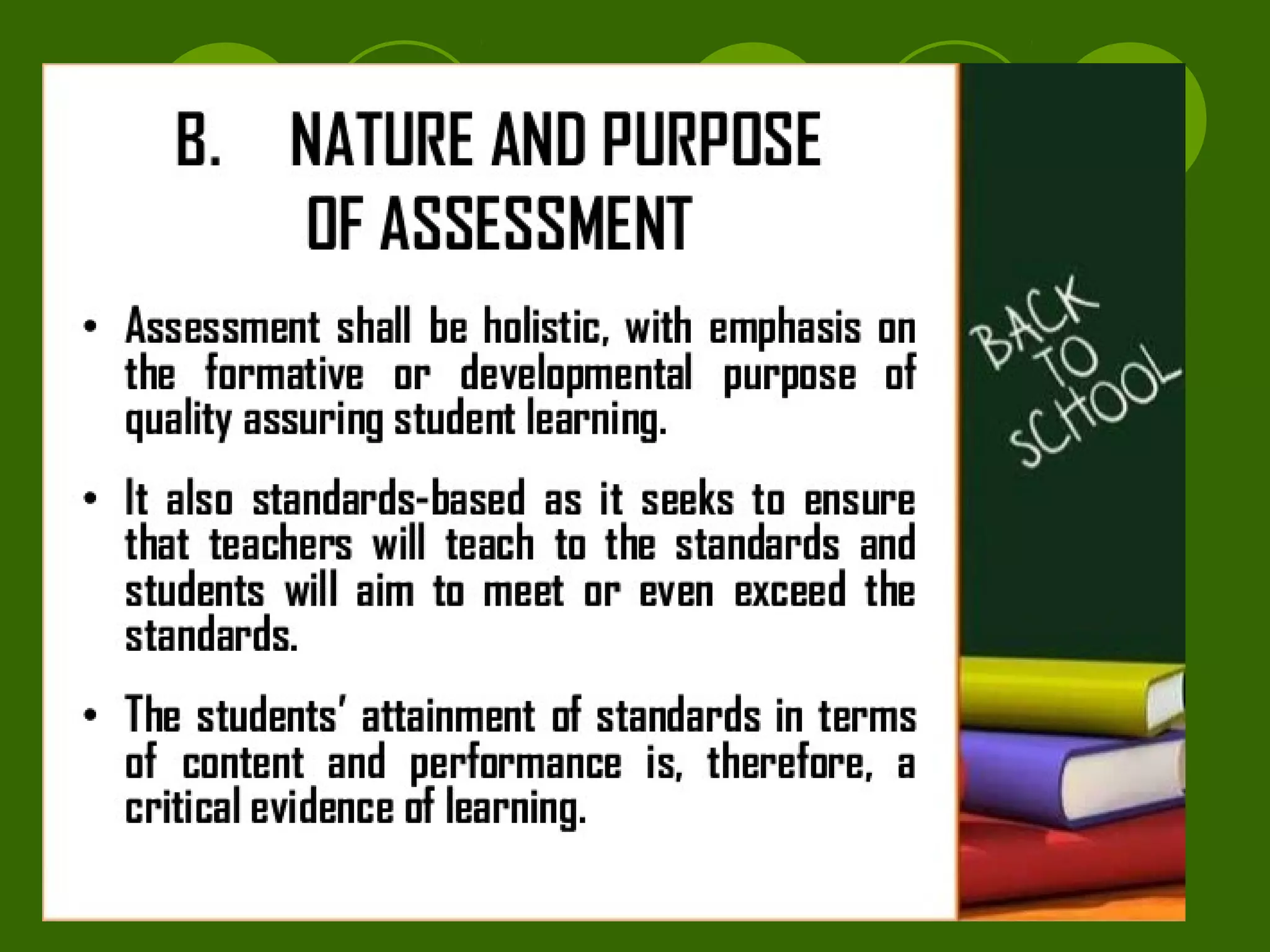 2. Effective assessment practices include sharing learning goals with students, involving students in self-assessment, and providing feedback to help students improve. Both teachers and students should view assessment as a cooperative process to support learning.