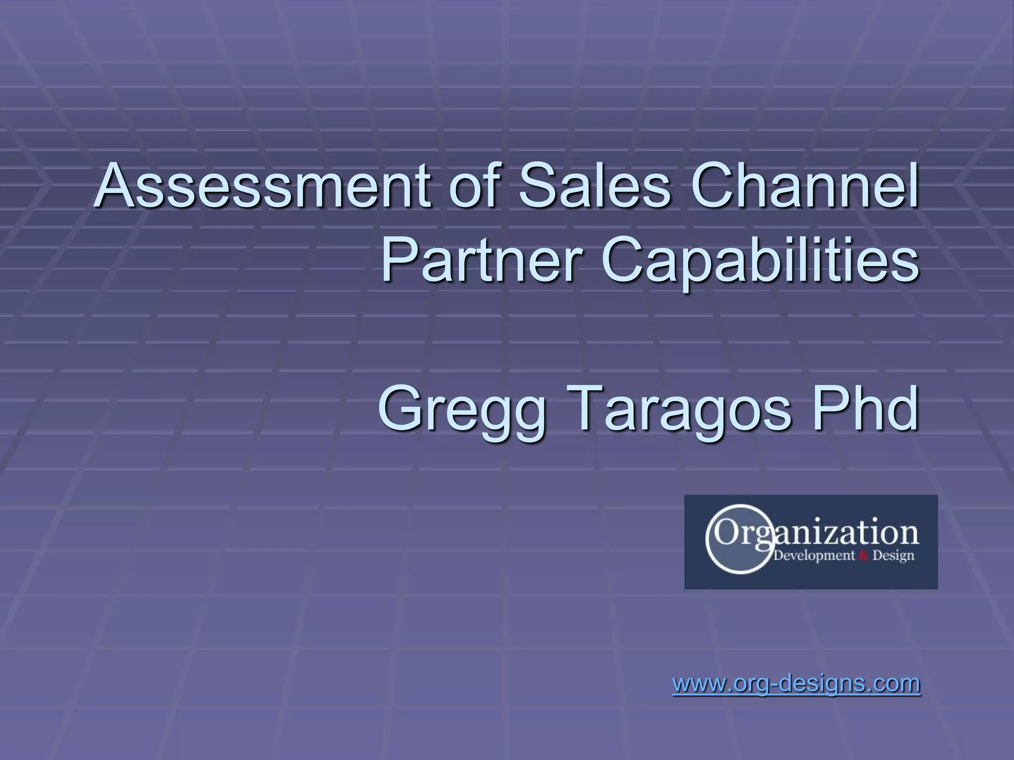 The document discusses assessing sales channel partner capabilities. It provides principles for building successful partnerships, including assessing channel strategy and capabilities, aligning people, programs, and resources, implementing measurable performance solutions, and tracking continuous improvement. The document outlines competency assessment, dashboards and measures, business driver analysis, steering teams, process mapping, program assessment, recognition strategies, and available resources. It discusses isolating high-impact sales behaviors, building a competency model, conducting behavioral assessments, business driver analysis, key measures, and developing competency-based tools to improve performance.