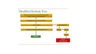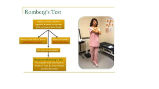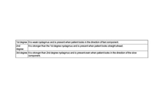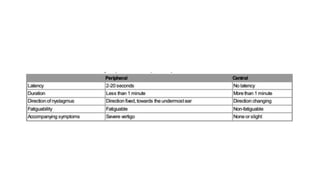 This document discusses tests used to assess vestibular function, including nystagmus, caloric testing, fistula testing, optokinetic testing, and galvanic testing. It also covers peripheral vestibular disorders like BPPV and vestibular neuronitis, as well as central causes of nystagmus. Diagnosis and treatment of BPPV is discussed, including Epley's maneuver and surgical options.