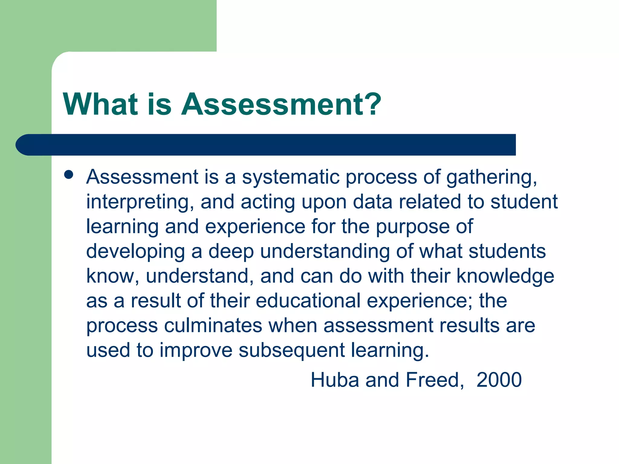 This document discusses student assessment and the assessment process. It defines assessment as a systematic process of gathering data related to student learning to understand what students know and can do. The key points are that assessment is ongoing, uses multiple methods, criteria and standards, and provides evidence of student understanding. The assessment process involves setting aims, taking action through assessment, and making adjustments. Assessment is important to understand student knowledge, skills, processes, and motivation. It should involve teachers, students, peers, administrators and parents. The results of assessment should be used to improve instruction, provide feedback, and report on student progress.