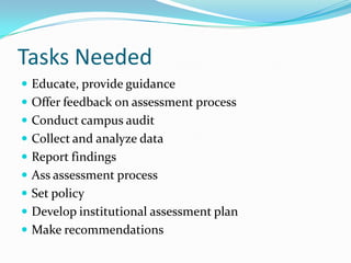 This document outlines the organizational structure and tasks involved in an institution's assessment process. It discusses the roles of key groups like the Institutional Effectiveness Committee, academic units, support units, and the Office of Institutional Research and Planning. It also provides examples of tasks these groups may perform, such as setting policy, reviewing assessment artifacts, examining program plans and reports, and providing expertise in assessment methodology. Finally, it gives guidance on developing an assessment plan, including conducting an audit of current practices, devising a matrix to track progress, and creating an effective communication strategy to roll out the assessment process.