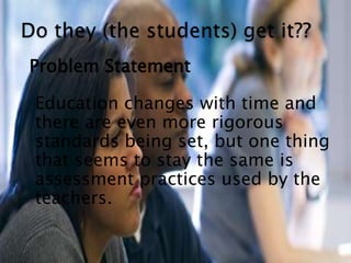 2) It advocates moving from solely using summative assessments to also using formative assessments to motivate students and increase their achievement. A three-step process is described to evaluate assessment practices at the student, instructional, and policy levels.