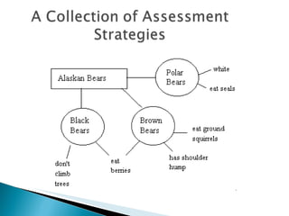 This document provides descriptions of various assessment tools and strategies that teachers can use to evaluate student learning in non-traditional ways beyond traditional tests. It includes graphic organizers, interviews, observations, performance tasks, creative exhibitions, self-evaluations, journals, contracts, and portfolios that are designed to enhance student understanding and promote lifelong skills. These alternative assessment methods need not take away from learning time and can themselves be learning experiences.