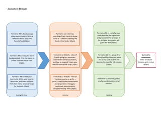 The assessment strategy involves formative assessments to evaluate students' reading, writing, listening, and speaking skills related to food and recipes. There are assignments to write reflections on favorite foods, create recipes with a partner, fill in a recipe card, identify foods ordered in a cafeteria recording, create a restaurant script, determine swapped items for a picnic, discuss healthy dishes in a group, and describe recipes orally for others to guess. The summative assessment is creating an original video and script with a partner.