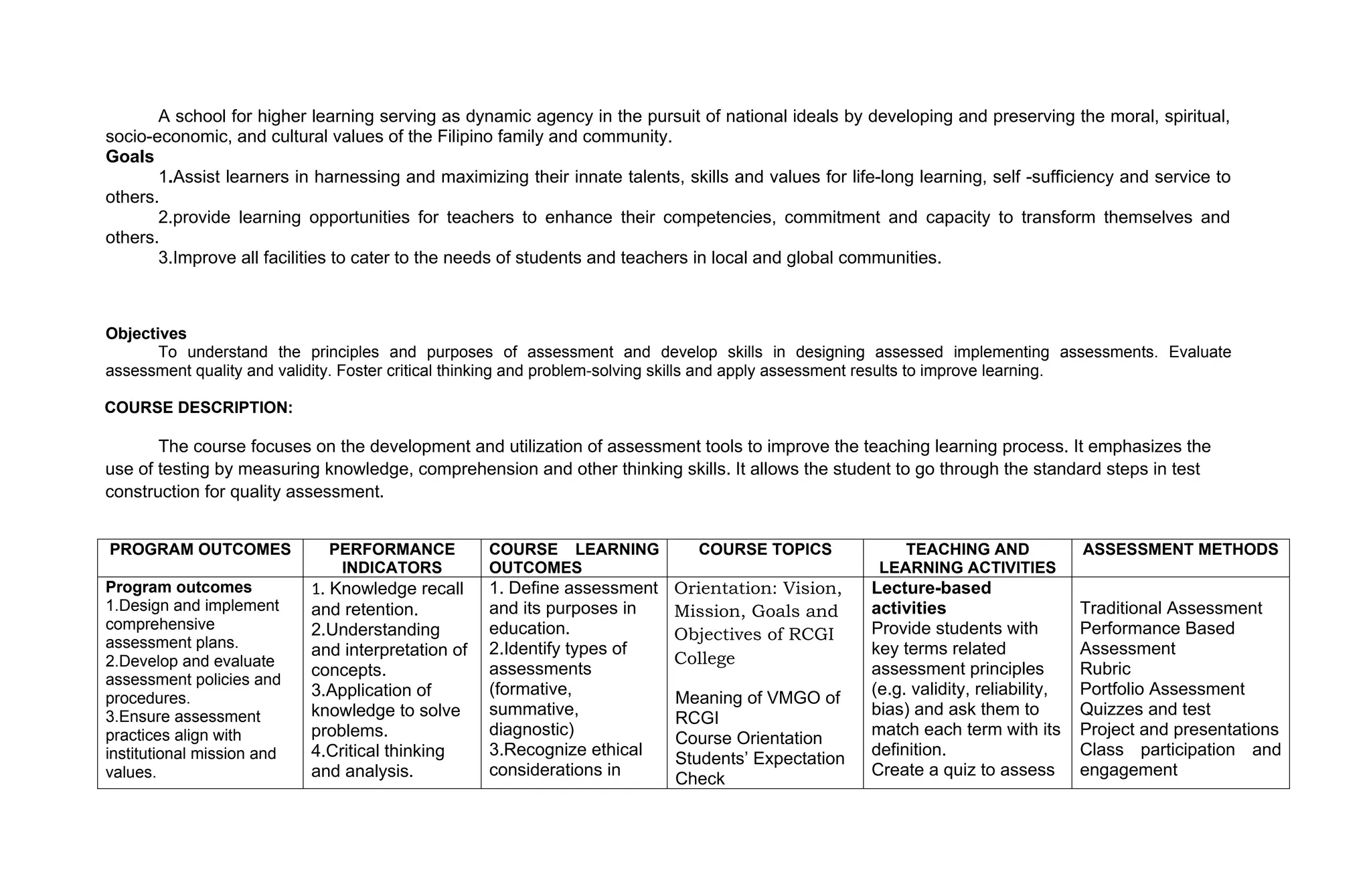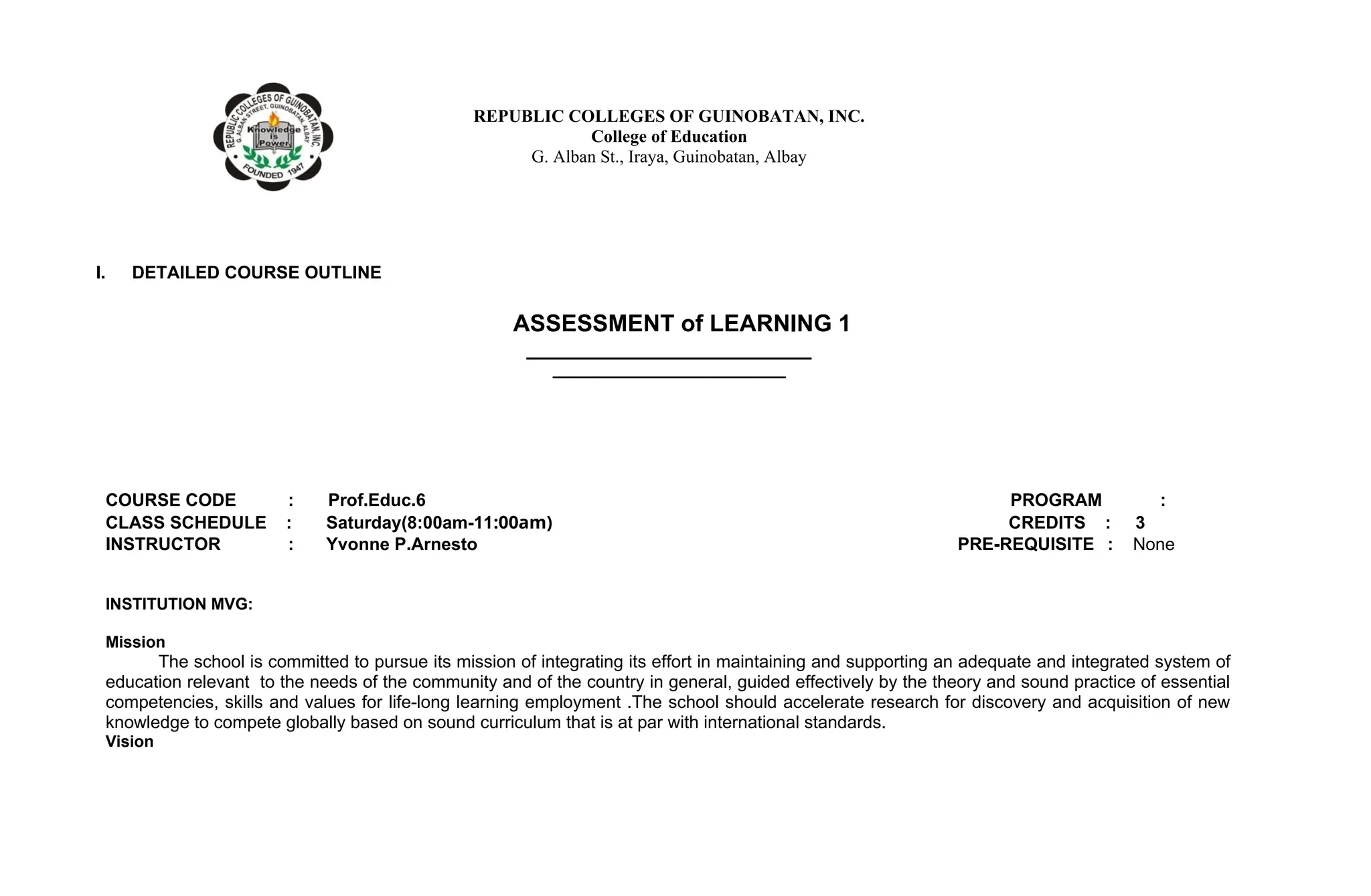 The document outlines the detailed course syllabus for 'Assessment of Learning 1' at Republic Colleges of Guinobatan, Inc., detailing the course's mission, vision, goals, objectives, and outcomes. It includes essential information on assessment principles, various types of assessments, and expected competencies for both students and instructors. Additionally, it specifies course requirements, grading systems, and activities designed to engage students in understanding and applying assessment methods.