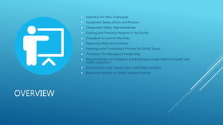 The document outlines the Occupational Health and Safety (OH&S) procedures for a design workplace, covering employee induction, equipment safety checks, hazard reporting, and emergency management. It emphasizes the responsibilities of both employees and employers regarding health and safety, along with team dynamics and roles within the organization. Additionally, it provides resources for further information related to OH&S national policies.