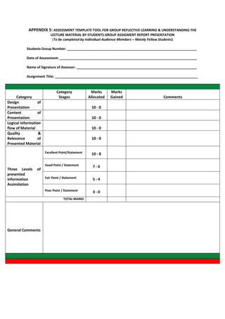 The document is an assessment template for students to evaluate group presentations on assigned material. It contains categories for design, content, logical flow, quality of material, and levels of assimilation. Students are to rate presentations on a 10 to 0 scale in each category. They also provide a total mark and general comments on the group's understanding and presentation of the assigned lecture material.