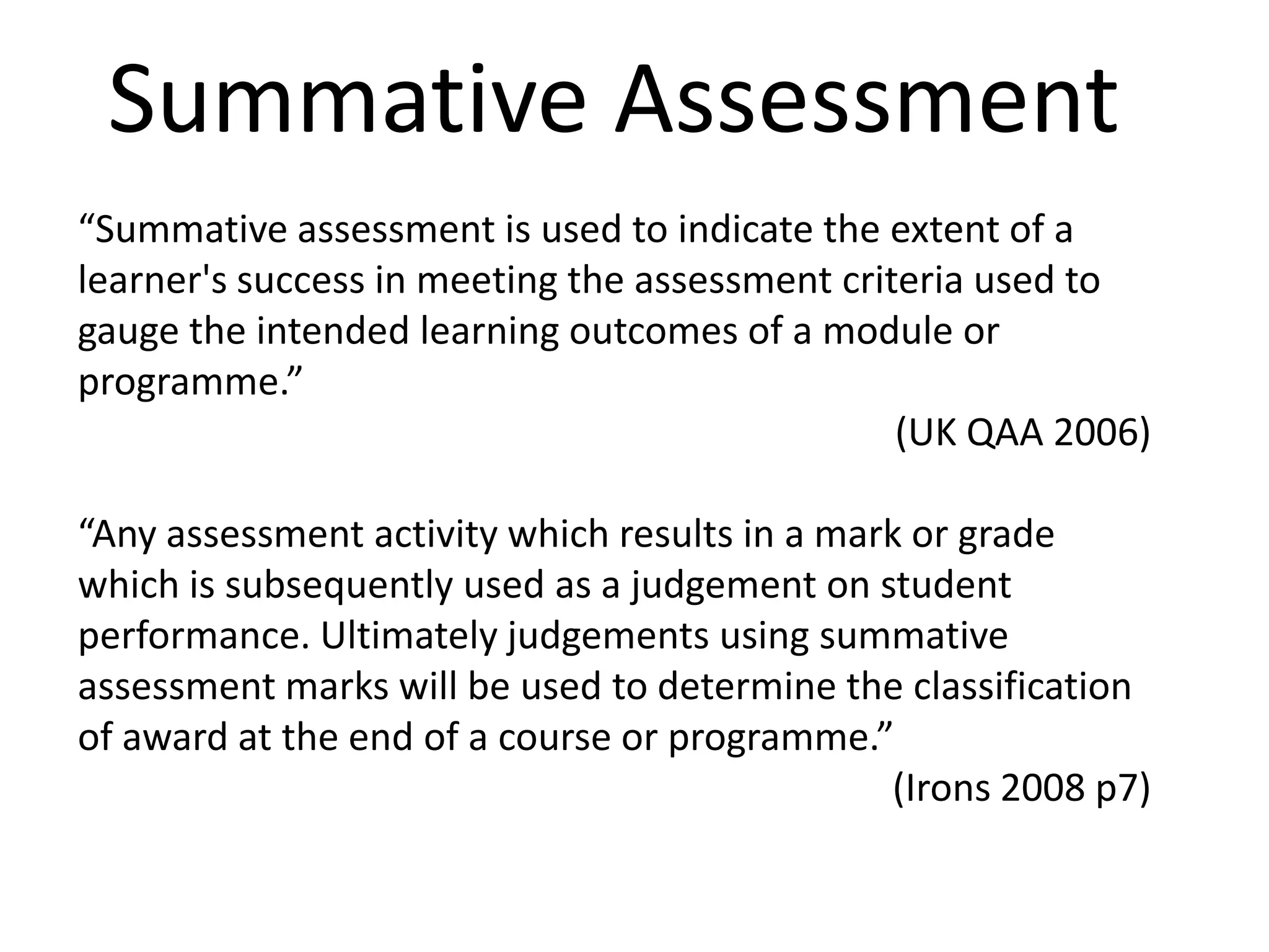 The document discusses assessment in education. It defines assessment as measuring student learning and using that information to make judgements to inform decision making. Assessment impacts student learning behavior by guiding their study and influencing their perceptions of what is important. Summative assessment indicates student success in meeting intended learning outcomes, while formative assessment is used to support learning. Effective assessment should be valid, reliable, and fair, and reflect intended learning outcomes. A variety of assessment methods can be used to evaluate different parts of the subject matter.