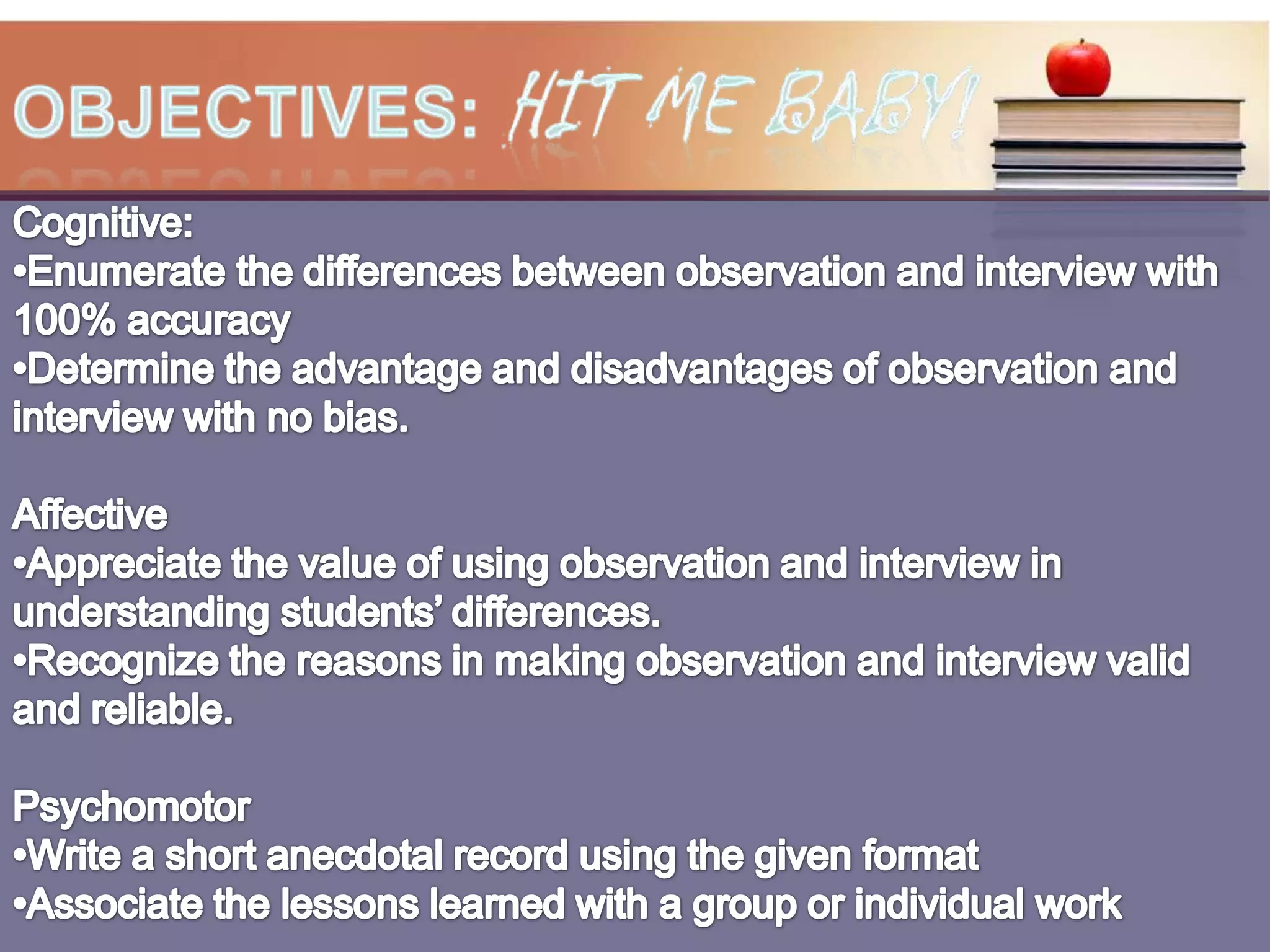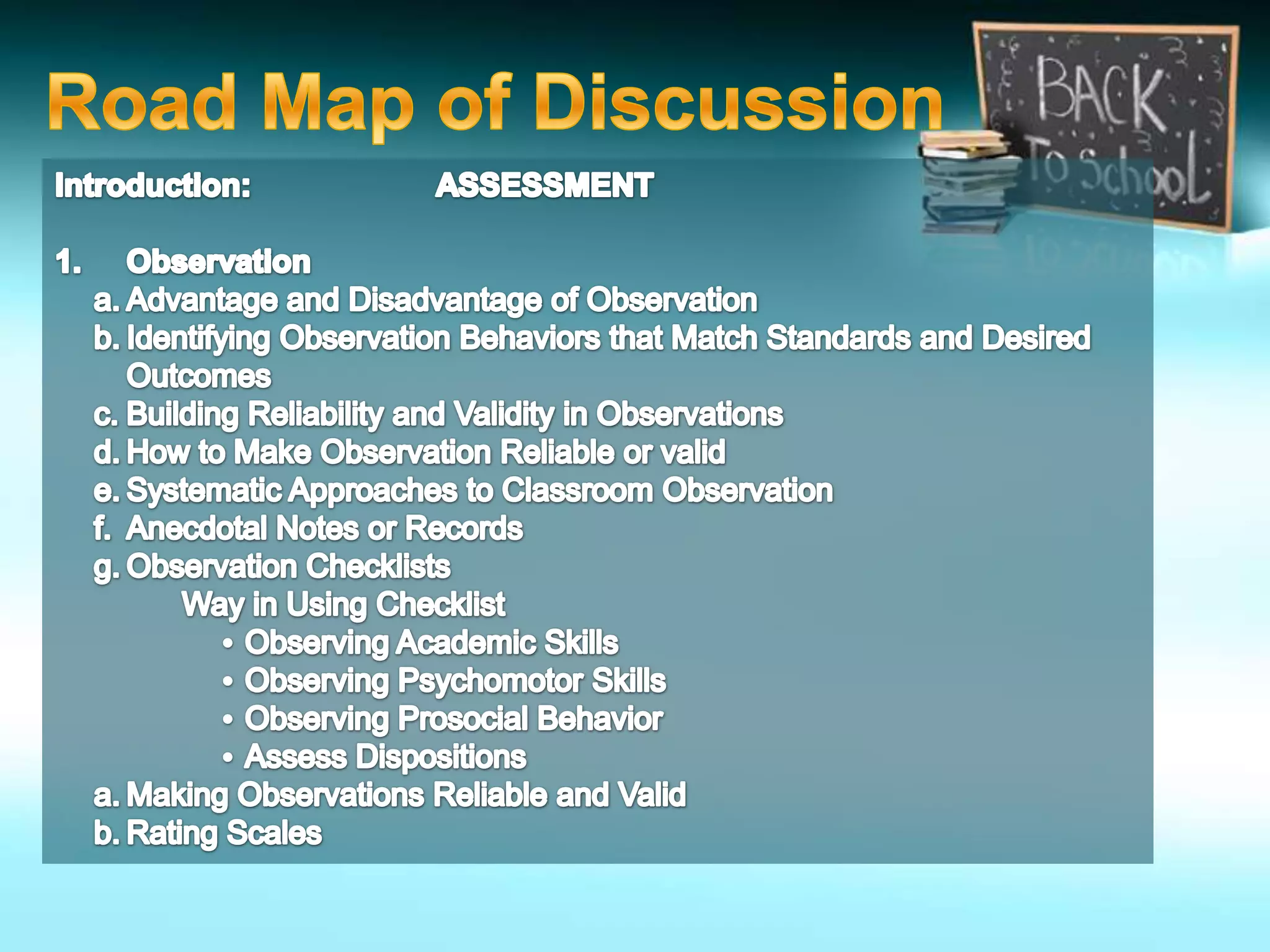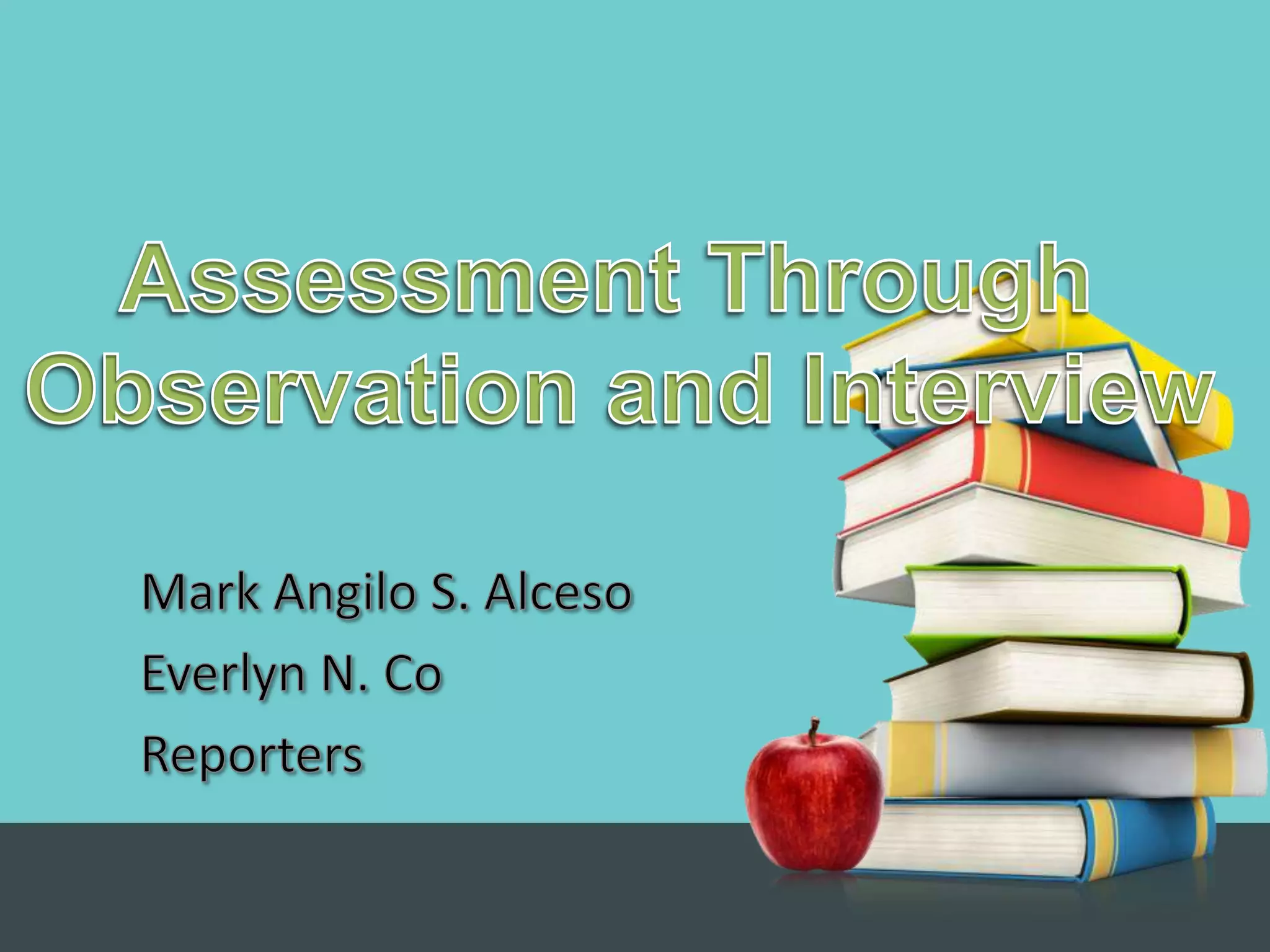 This document provides information about assessment, specifically observation and interviews as assessment methods. It discusses: