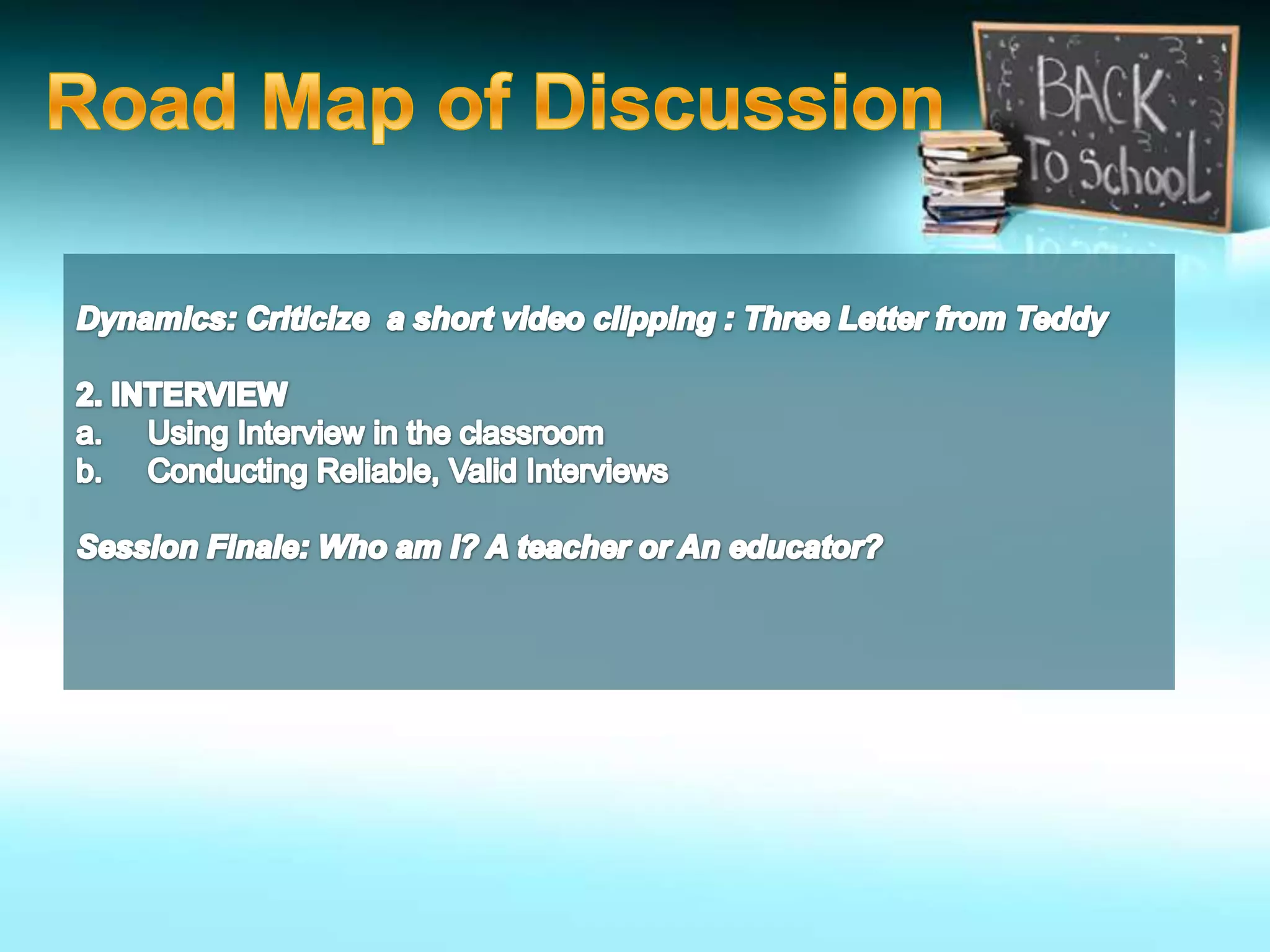 - Interviews as another direct way to get to know students. It recommends planning questions, contexts, and a data collection tool in advance, as well as focusing during interviews and promptly reviewing notes afterward.