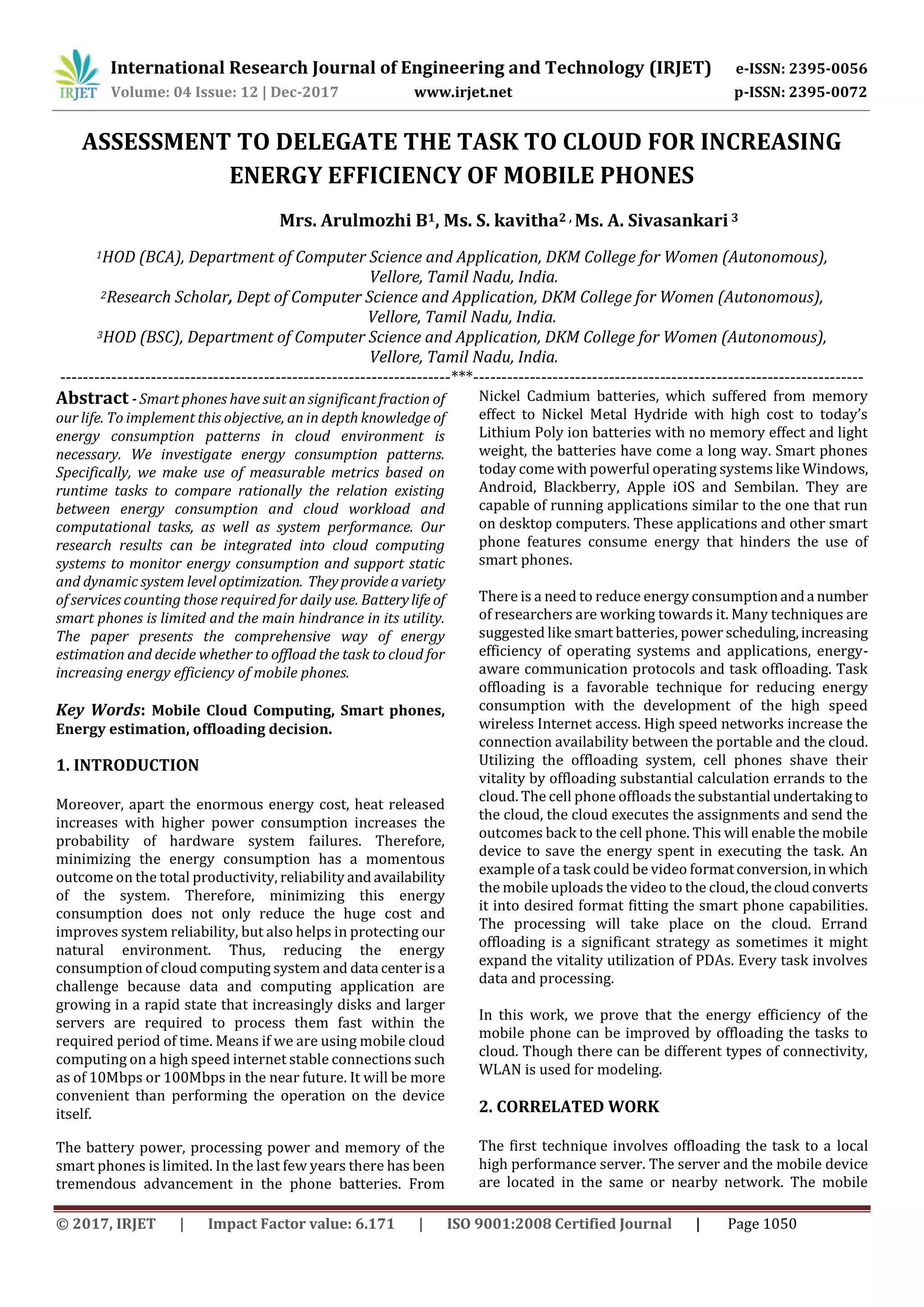 This document discusses assessing whether tasks on mobile phones should be offloaded to the cloud to improve energy efficiency. It presents a model where mobile devices can offload computationally intensive tasks to the cloud via wireless networks. An experiment is described that compares the energy consumption and time taken of a video conversion task performed locally on a mobile phone versus offloading the task or different parts of the task to a cloud. The results show that offloading the entire task to the cloud reduces energy consumption and processing time compared to performing the task locally on the mobile phone. The document concludes offloading tasks to the cloud can increase a mobile phone's energy efficiency and discusses areas for future work.