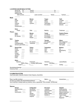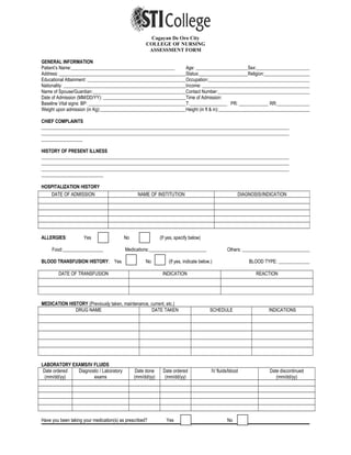 This document appears to be an assessment form used by a College of Nursing to collect patient information. It includes sections to document a patient's general information, chief complaints, medical history, vital signs, nutrition, elimination, activity levels, physical examination findings, cognition, and pain. The physical exam section includes detailed assessments of different body systems to document the patient's current health status.