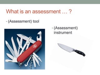 This document discusses assessment tools and rubrics. It defines assessment tools and the four main types of assessment: diagnostic, evaluative, formative, and summative. It explains validity, reliability, and the learning continuum from novice to expert. Methods of assessment include direct observation, projects, essays, and reports from supervisors. The document defines rubrics and how they describe varying levels of quality. It provides an example rubric and discusses benefits of rubrics for students and teachers, such as making expectations clear, measuring progress, and developing responsibility. Reasons to involve students in designing rubrics are also presented. The document concludes with instructions on how to design a rubric.