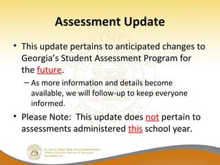 The document summarizes anticipated changes to Georgia's student assessment program. It notes that Georgia will transition to a new assessment system aligned to college and career ready standards, consolidating reading, language arts, and writing assessments. This new system will be more rigorous, coherent across grades, and include online administration over time. The transition provides an opportunity for Georgia students to be better positioned nationally, but it also brings uncertainty that will be addressed through guidance on standards, sample items, and readiness indicators.
